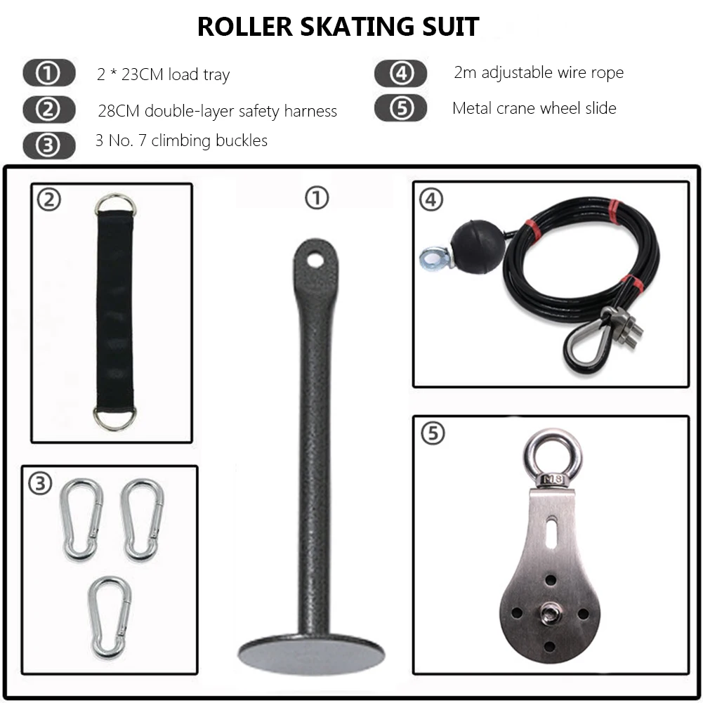 1 x Wire Rope 1 x Load Bearing Strap 1 x Metal Roller Slide 3 x Mountaineering Buckle